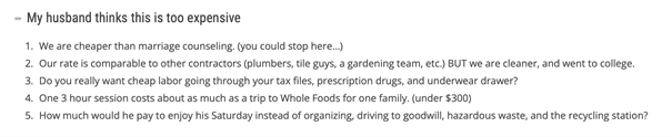 Have you noticed that clients usually have similar objections or ask similar questions before they sign a contract with you? To make it easier for your future clients, approach your FAQ page as a small knowledge base where you list questions you anticipate from potential customers and answer them in a way that prevents misunderstanding and overcomes objections, just like in the example below.