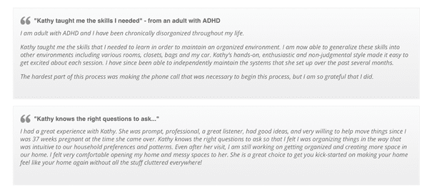 - Challenges – write about specific challenges your clients have faced (e.g. decluttering their attic within three days)